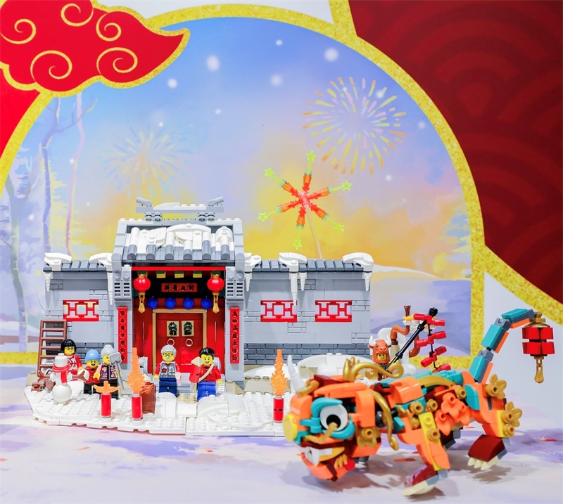 年味濃厚的樂(lè)高年的故事套裝以樂(lè)高積木顆粒的方式重現(xiàn)“年”的故事,同時(shí)歡慶農(nóng)歷新年。這款套裝以一座白雪襯托下的、帶有各種傳統(tǒng)裝飾的中式民居為主體。借助一只可擺出各種姿勢(shì)的年獸、雪人玩偶和六個(gè)樂(lè)高小人仔(其中包括爺爺,奶奶,三個(gè)孩子和一個(gè)假扮成牛的裝扮者),這款套裝非常適合展示和角色扮演,共同慶祝2021年中國(guó)農(nóng)歷牛年的到來(lái)。