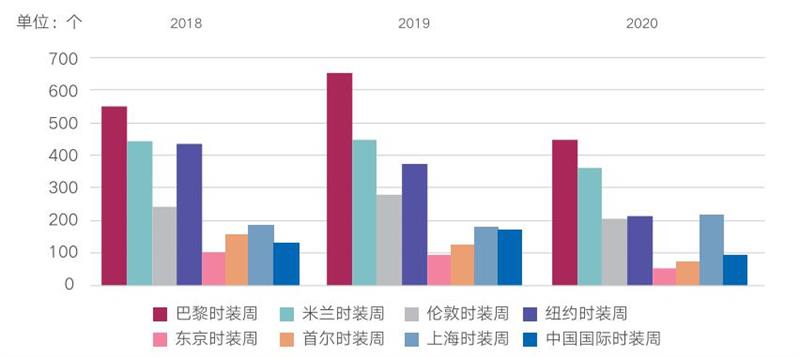 圖為時裝周參展品牌數(shù)量(2018-2020年)