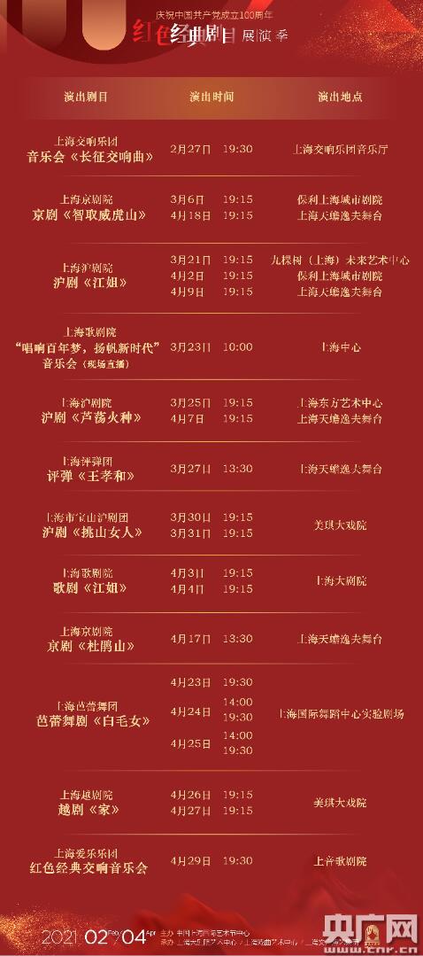 央廣網(wǎng)上海2月25日消息(記者周洪 林馥榆)上海紅色文藝報春早!今年2月至4月,上海文藝界紛紛亮出“紅色家底”,9家文藝院團(tuán)獻(xiàn)上的12臺紅色優(yōu)秀經(jīng)典作品,涵蓋音樂、舞蹈、戲劇、戲曲等多種藝術(shù)形式,線上線下共迎建黨百年。
