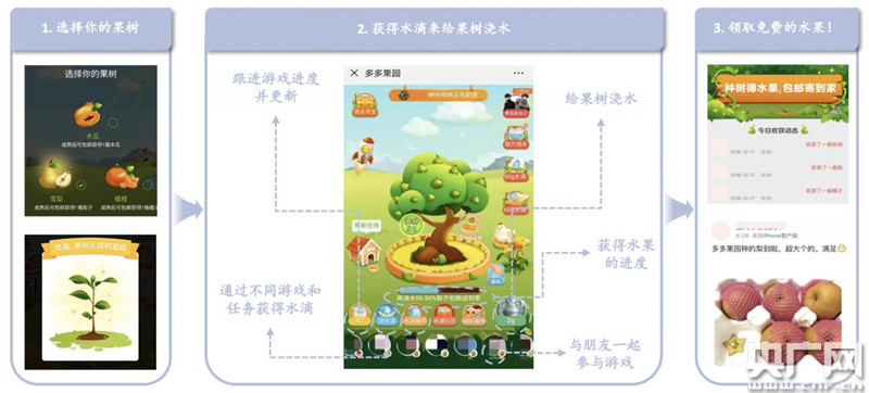 “多多果園”成功將游戲娛樂與扶貧助農相結合,用戶通過社交互動的方式培育虛擬果樹,可以免費收到一份由拼多多送出的扶貧助農水果。
