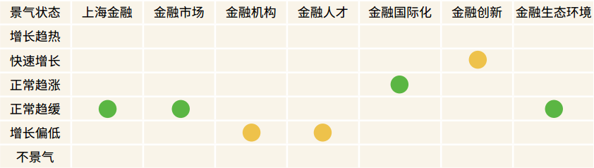 為了更直觀地展示各項指標當年增速相對于過去五年平均增速的情況,指數(shù)報告引入了“燈號圖”的分析方法。從燈號評價結(jié)果看,2020年金融景氣指數(shù)整體呈“綠燈”信號,六項一級指標“三綠三黃”,其中金融創(chuàng)新子指數(shù)處于快速增長狀態(tài),增速高于過去五年均值的1.5 倍。