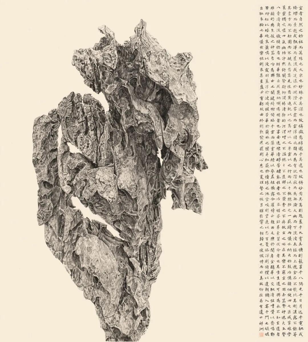 幾件文人賞石繪畫作品《萬殊之宗》《嵌空此日成》《泰一之道》亦是展覽的重要組成部分。石頭進(jìn)入中國(guó)繪畫史的歷程源遠(yuǎn)流長(zhǎng),并早已脫離單純的物象刻畫而進(jìn)入中國(guó)文人的精神生活空間,帶有審美與觀念哲學(xué)的雙重關(guān)照。在泰祥洲的賞石繪畫中,在續(xù)借中國(guó)的這一文人傳統(tǒng)之外,藝術(shù)家賦予了其更多的時(shí)間和空間意味,而與天象系列作品形成互文,令人望石而思索人生和宇宙的意義。