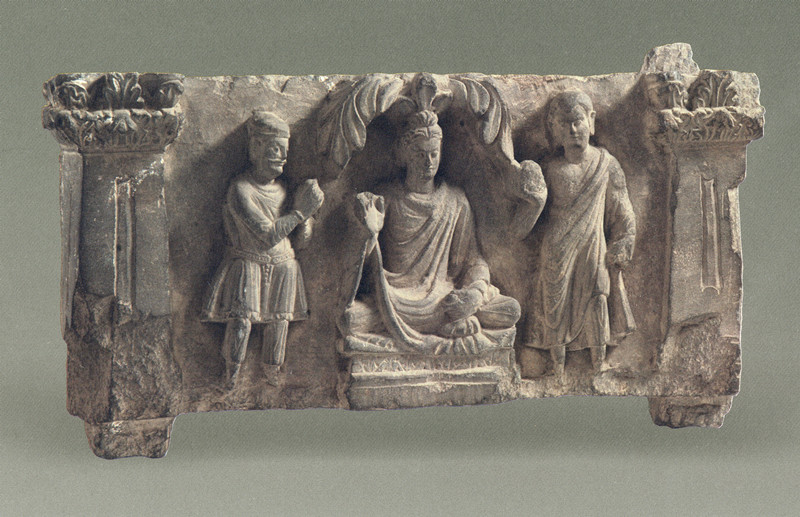 貴霜王朝時期,對于亞歷山大東征后留下的種種希臘羅馬藝術(shù),對來自西邊的伊朗高原上的瑣羅亞斯德教、東南邊印度半島的印度教和佛教,都采取了兼收并蓄的包容態(tài)度,這極大豐富了貴霜時期的藝術(shù)表達方式。展覽中的“豐收女神坐像”是希臘藝術(shù)中常用到的素材,女神衣裙紋線流暢優(yōu)美,右手上舉,左手于膝頭持握豐饒角(Cornucopia),表情慈祥。從此件雕塑中,可以看出希臘藝術(shù)在貴霜地區(qū)的深入影響。另一件展品“禮拜佛陀建筑構(gòu)件”上的浮雕描述了菩薩、供養(yǎng)人共同聆聽釋迦牟尼說講佛法的場景,象征希臘建筑雕塑的科林斯柱頭與講經(jīng)說法場景協(xié)調(diào)于一處。