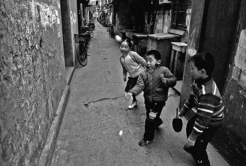孩子在弄堂中,對(duì)著墻壁打乒乓球