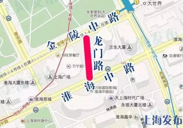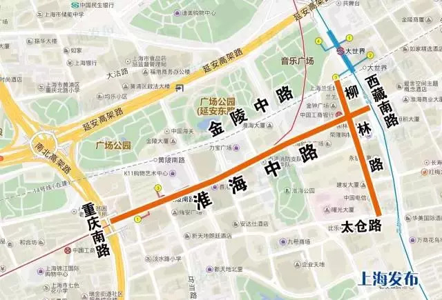淮海中路(西藏南路~重慶南路)、柳林路(金陵中路~太倉路)禁止車輛通行,公交采取繞道措施。