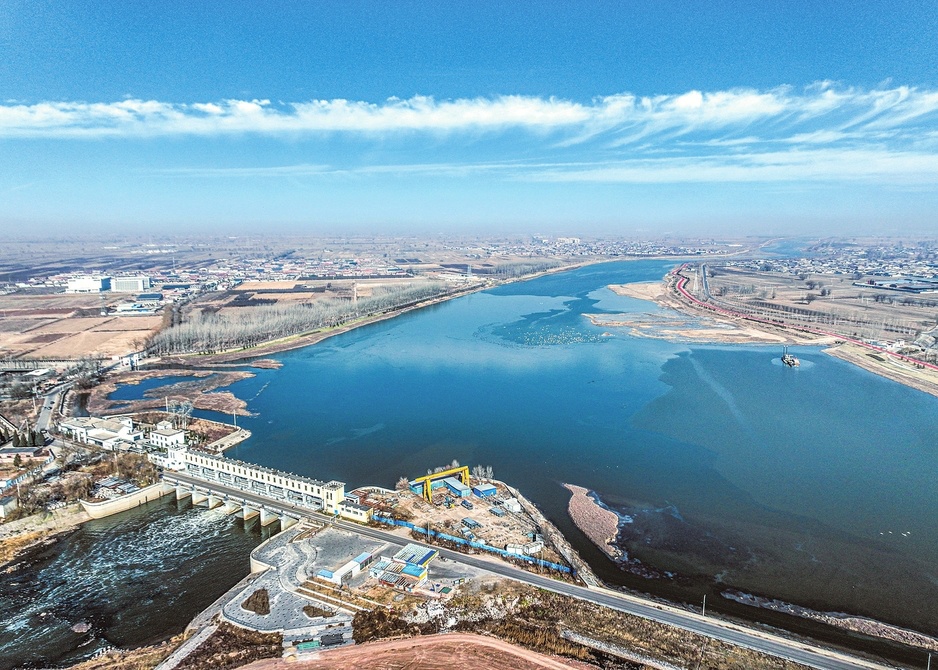 日前,山西省平遙縣境內(nèi)的汾河三壩庫區(qū),天空一碧如洗,清澈的汾河水與兩岸的村莊、道路、橋梁等,構(gòu)成一幅美麗的冬日畫卷。(梁生仁 攝)