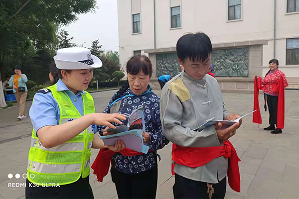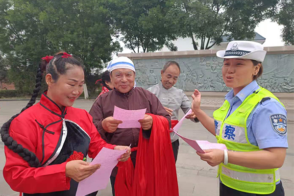 活動現(xiàn)場,民警向演員發(fā)放宣傳彩頁和交通安全常識讀本,面對面向大家普及道路交通安全知識,講解無證駕駛、酒后駕駛、違法載人、駕無牌無證車等交通違法行為的危險后果,并著重普及摩托車、電動車騎乘人員不按規(guī)定佩戴安全頭盔、機動車駕駛員不系安全帶等交通違法行為的危害性。引導群眾要摒棄交通陋習,自覺抵制交通違法行為,安全文明出行,共同創(chuàng)造安全有序、暢通文明的道路交通環(huán)境。