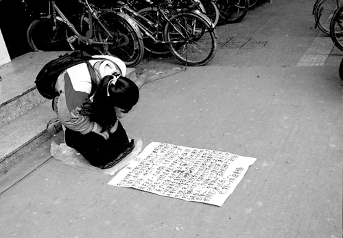 一名年輕女士看到男子手里“職業(yè)乞丐”的牌子后,仍然給該乞丐1元錢。 圖片來自西部網(wǎng)