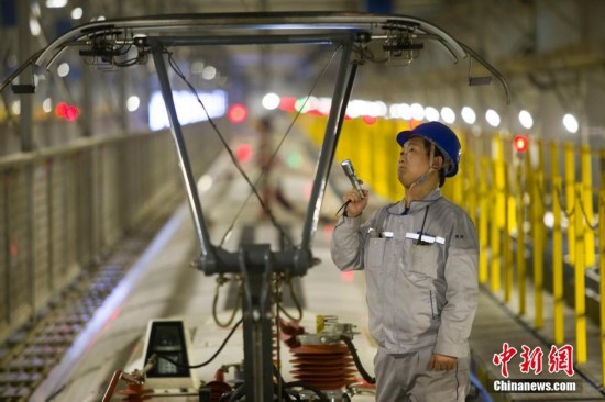 12月4日消息,西安至成都高鐵開(kāi)通在即,中國(guó)鐵路西安局集團(tuán)有限公司西安動(dòng)車(chē)段進(jìn)入忙碌的時(shí)期,動(dòng)車(chē)段機(jī)械師們開(kāi)始對(duì)即將在西成線上正式運(yùn)營(yíng)的動(dòng)車(chē)組列車(chē)進(jìn)行全面“體檢”。每組動(dòng)車(chē)組下線入庫(kù)后都要進(jìn)行車(chē)頂、車(chē)內(nèi)、車(chē)底以及行車(chē)數(shù)據(jù)分析等項(xiàng)目的檢查,確保其“身強(qiáng)體健”地投入到西成高鐵的運(yùn)營(yíng)中。據(jù)悉,每列動(dòng)車(chē)組檢修下來(lái)需要三個(gè)半小時(shí),動(dòng)車(chē)組機(jī)械師們每檢查1列動(dòng)車(chē)組,需要行走15列動(dòng)車(chē)組長(zhǎng)度的路程。圖為質(zhì)檢員在復(fù)查西成高鐵動(dòng)車(chē)組車(chē)頂高壓設(shè)備狀態(tài)。 王曙天 攝