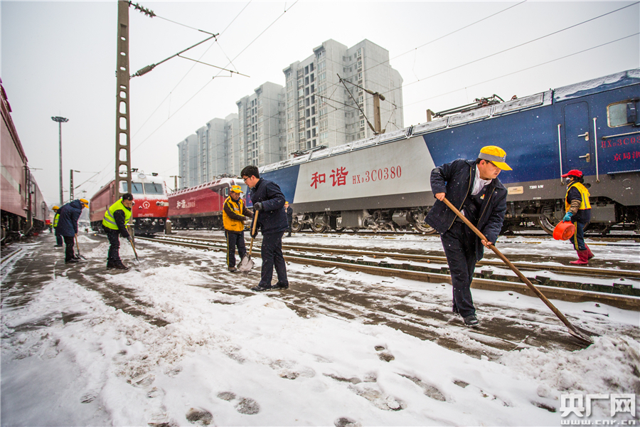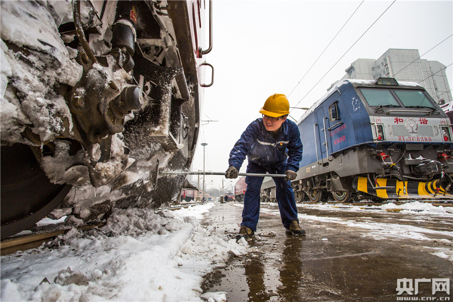 1月25日,西安機(jī)務(wù)段機(jī)車整備場(chǎng),檢修人員在風(fēng)雪中對(duì)完成任務(wù)歸來的機(jī)車進(jìn)行清雪除冰,為擔(dān)當(dāng)下趟旅客列車牽引任務(wù)做好準(zhǔn)備。央廣網(wǎng)發(fā) 劉翔 攝 -