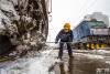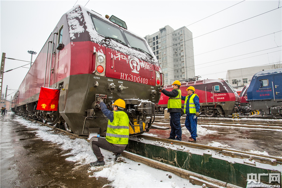 1月25日,西安機(jī)務(wù)段機(jī)車整備場(chǎng),檢修職工在風(fēng)雪中認(rèn)真檢查機(jī)車副燈和直流供電插座狀態(tài),保證機(jī)車以可靠狀態(tài)牽引旅客列車安全運(yùn)行。央廣網(wǎng)發(fā) 劉翔 攝 -