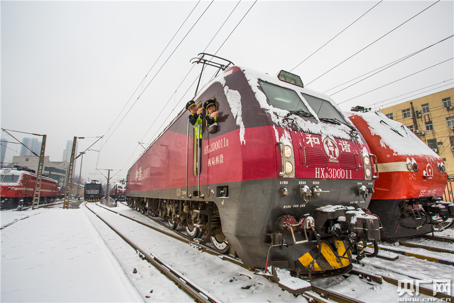 1月25日,西安機(jī)務(wù)段機(jī)車整備場(chǎng),火車司機(jī)在風(fēng)雪中出發(fā)擔(dān)當(dāng)西安至神木K8198次旅客列車值乘任務(wù)。央廣網(wǎng)發(fā) 劉翔 攝