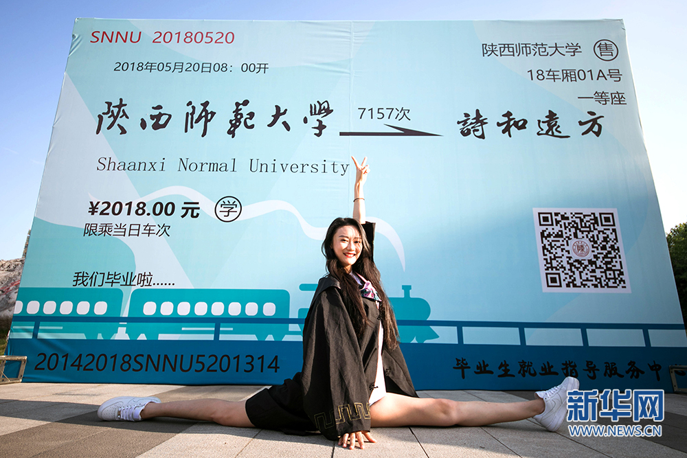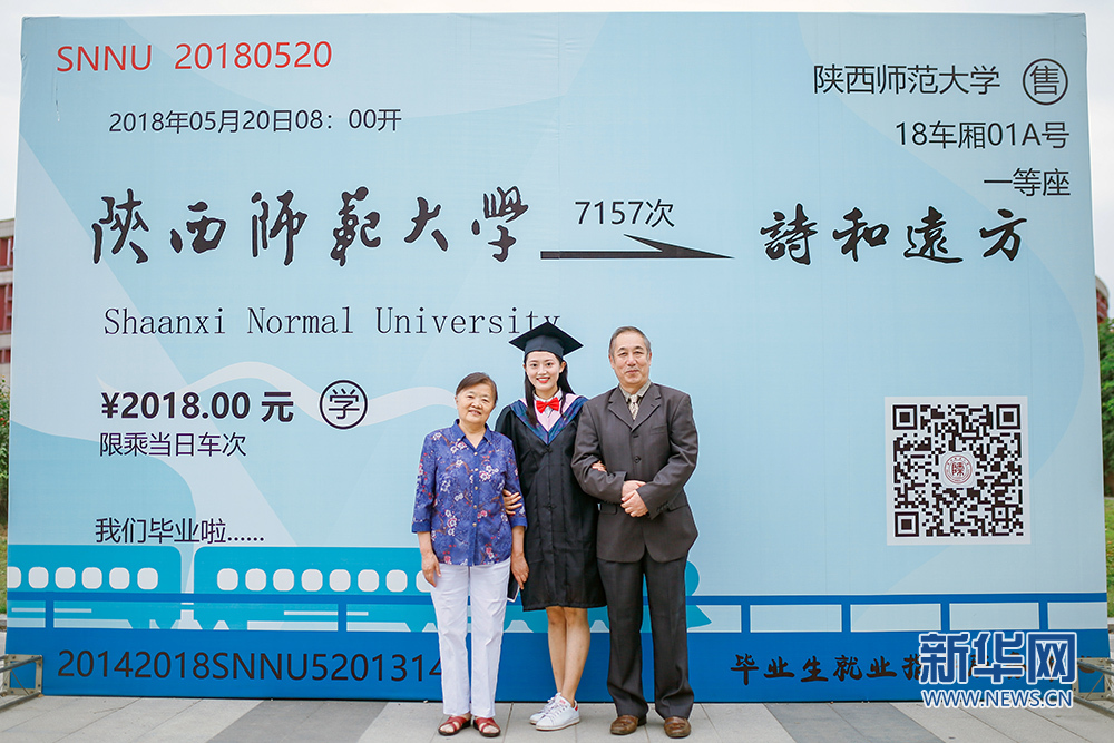 陜西師范大學(xué)畢業(yè)生帶著家人在校園畢業(yè)海報(bào)前留影紀(jì)念。新華網(wǎng)發(fā) 王江川攝 六月的夏季帶著離別的味道,而第一次踏進(jìn)校園的悸動(dòng)至今記憶猶新。從軍訓(xùn)服到學(xué)士服,從大學(xué)生到“社會(huì)人”,是你看著我一點(diǎn)點(diǎn)成長(zhǎng),教導(dǎo)我厚德、積學(xué)、勵(lì)志、敦行。畢業(yè)季悄然來(lái)臨,在離開(kāi)之前,陜西師范大學(xué)的畢業(yè)生用獨(dú)特的姿態(tài)與校園合影,留下屬于自己的專(zhuān)屬記憶。(汪艷)