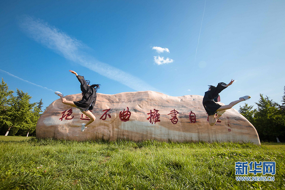 畢業(yè)生用獨(dú)特的姿態(tài)在圖書(shū)館前留影紀(jì)念。新華網(wǎng)發(fā) 楊思宇攝 -