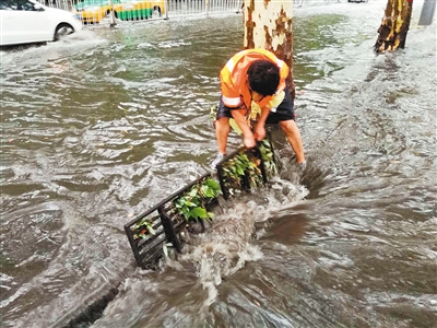 昨日,市政人員打開收水井蓋排水。記者 康喬娜 攝