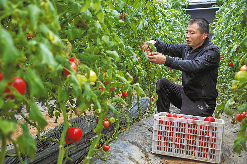 與此同時,旁邊的西紅柿大棚里同樣一派繁忙。種植戶尚國平帶著幾名工人,有序進行采摘、套袋、裝箱、打包等工作。