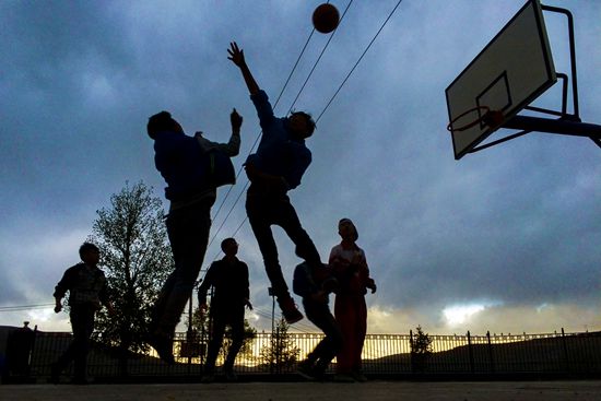 2016年5月19日,寧夏西海固小坡小學(xué),王曉春陪孩子們一起打籃球。在村小堅(jiān)守15年,當(dāng)?shù)赝卸夹ΨQ王曉春為“最會(huì)要的校長(zhǎng)”!皩W(xué)校的圖書(shū)室所有的書(shū)柜和圖書(shū),還有孩子們看電影的投影儀、乒乓球桌等都是我要來(lái)的!蓖鯐源赫f(shuō)的“要”,是他一直與外面的公益組織保持著密切的聯(lián)系,孩子們需要什么他就去“要”什么。盡管條件非常有限,他總是想方設(shè)想滿足孩子們的需求。視覺(jué)中國(guó)供圖(資料圖片)