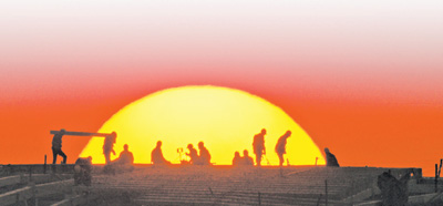 霞光映照下,工人在主航站樓頂部施工。
