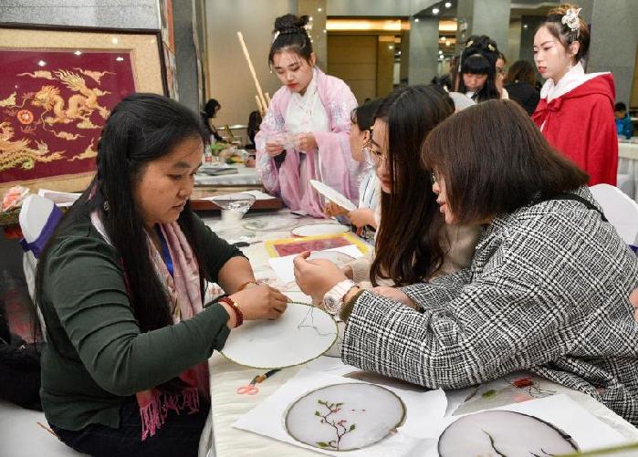 “媽媽,這潮繡真美!我想學(xué)。”11歲的賈一萌饒有興致地在潮繡展位前坐下,靜靜聆聽非遺傳承人李淑英老人講解潮繡的文化內(nèi)涵,并在老人的指導(dǎo)下體驗潮繡制作。“潮繡始于唐代,屬廣東刺繡,色彩濃艷美麗,在國內(nèi)外都享有盛譽! 李淑英老人告訴記者,她已經(jīng)是第三次來西安了,西安人民對潮繡很感興趣,她也非常樂于將祖國的優(yōu)秀文化遺產(chǎn)帶給西安人民,特別是西安的孩子們。
