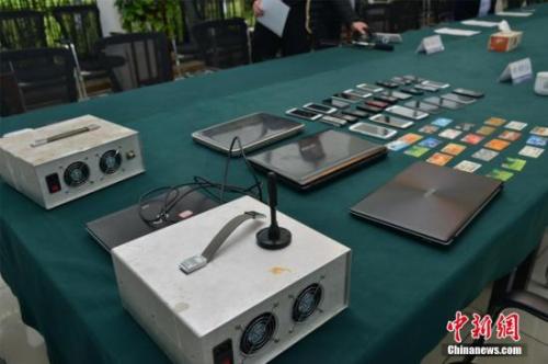 資料圖:廣東省公安廳內(nèi)展示的涉電信詐騙犯罪案中的作案工具。中新社發(fā) 陳驥旻 攝