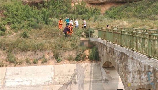 消防官兵到場(chǎng)后發(fā)現(xiàn),一具尸體漂浮在水庫(kù)旁的水渠里,水渠寬約10米,深約1米,見此情景,一名戰(zhàn)士在繩索保護(hù)下沿著水渠邊靠近浮尸,將安全繩索綁在男尸身上,隨后,岸上官兵一齊將男尸拉上岸。