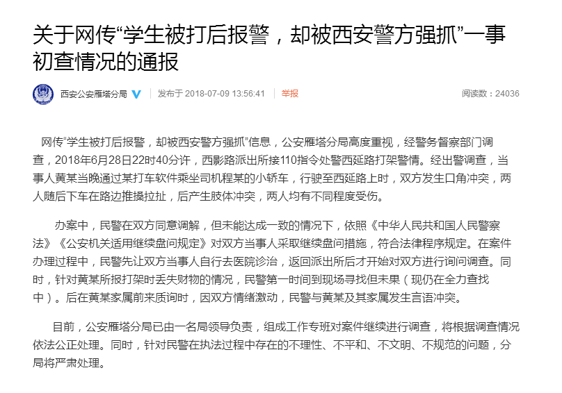 關(guān)于網(wǎng)傳“學(xué)生被打后報(bào)警,卻被西安警方強(qiáng)抓”一事初查情況的通報(bào)。