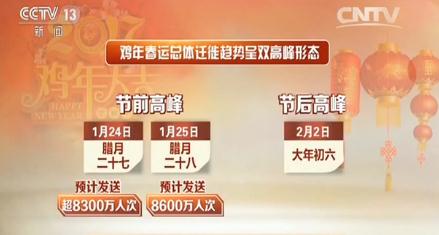 中國各地的火車站、長途客運(yùn)站以及飛機(jī)場等,在巔峰時刻成為世界上人口最密集的地方之一。雞年春運(yùn)總體遷徙趨勢呈雙高峰形態(tài),1月24日(臘月二十七)、25日(臘月二十八)為節(jié)前高峰,而2月2日(大年初六)則為節(jié)后遷徙高峰;預(yù)計24號發(fā)送旅客總量超8300萬人次;預(yù)計25日鐵路、公路、民航、水路日發(fā)送旅客總量達(dá)8600萬人次。