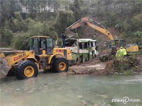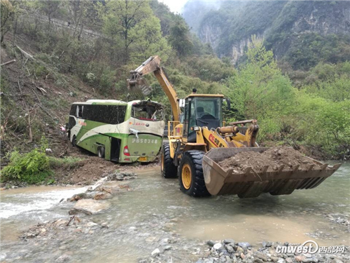 記者:“這里就是這起事故的事發(fā)現場,位于210國道西鄉(xiāng)堰口段,大家可以看到,現在在我身后,這輛大巴車的受損情況還是比較嚴重的,我們了解到對車內被困人員的救援一直持續(xù)到今天早上的9點才最終結束,F在救援人員正在將事故車輛帶離現場!