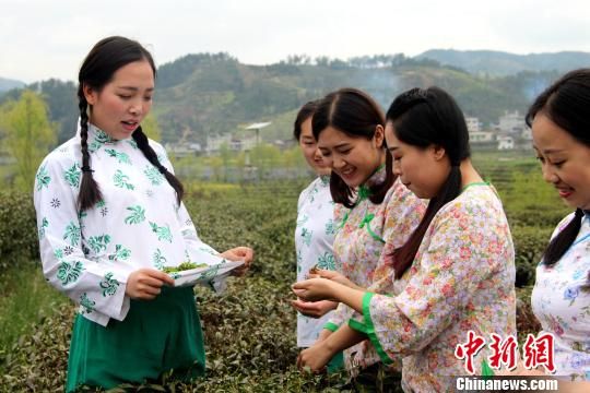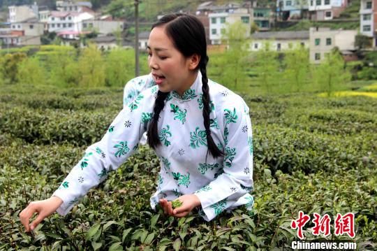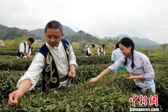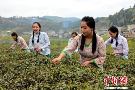 4月6日,位于陜西安康市紫陽縣的茶山上,身著當?shù)貍鹘y(tǒng)服飾的采茶人唱著《三月三上茶山》、《哥妹對歌》等采茶歌,手中忙著采摘,成為漫山遍野茶樹間一道靚麗的風景線。