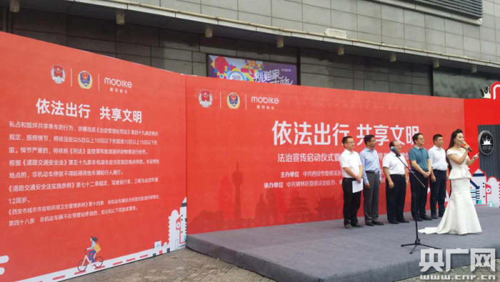 央廣網(wǎng)西安9月8日消息(記者雷愷)西安市委依法治市辦、西安市司法局聯(lián)合碑林區(qū)城管局、司法局和摩拜單車今天(8日)在西安舉行“‘依法出行 共享文明’法治宣傳啟動儀式暨共享單車普法停車點揭牌儀式”,在全國率先通過普法減少、遏制群眾隨意停放、惡意破壞、私自占有共享單車的行為。