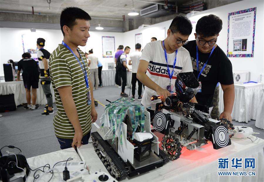 6月9日,來自西安文理學(xué)院的學(xué)生在展會(huì)上調(diào)試機(jī)器人。當(dāng)日,西安·雁塔大學(xué)生青春設(shè)計(jì)博覽會(huì)暨硬科技創(chuàng)新展在陜西西安大都薈開幕,來自西安市雁塔區(qū)13所大專院校的學(xué)生攜平面設(shè)計(jì)、工藝美術(shù)、影視制作等七大門類1000余件優(yōu)秀設(shè)計(jì)作品及近70件“硬科技”作品參加展示。新華社記者 劉瀟 攝 -