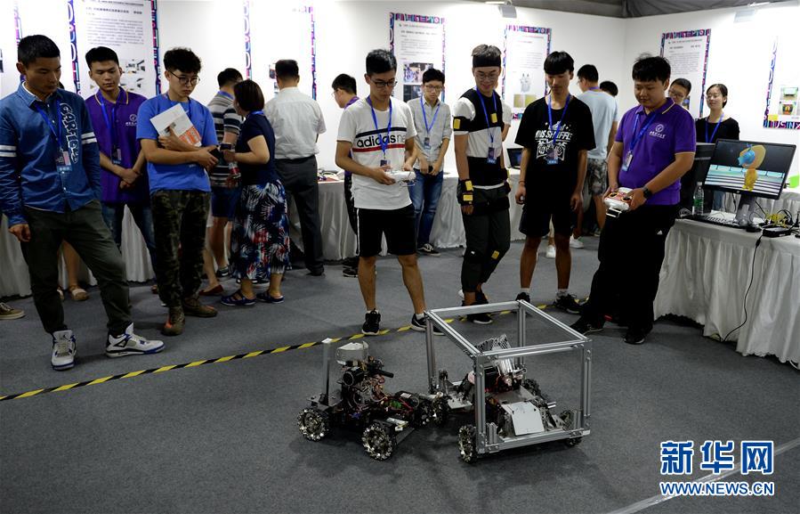 6月9日,參展學(xué)生在展會(huì)上進(jìn)行機(jī)器人對(duì)抗演示。當(dāng)日,西安·雁塔大學(xué)生青春設(shè)計(jì)博覽會(huì)暨硬科技創(chuàng)新展在陜西西安大都薈開幕,來自西安市雁塔區(qū)13所大專院校的學(xué)生攜平面設(shè)計(jì)、工藝美術(shù)、影視制作等七大門類1000余件優(yōu)秀設(shè)計(jì)作品及近70件“硬科技”作品參加展示。新華社記者 劉瀟 攝