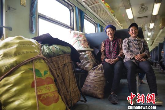 資料圖:“扶貧”列車上,婦女正守護(hù)著自己的貨品!↓忀妗z