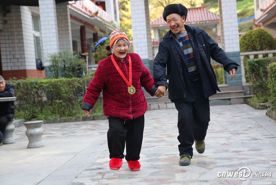 西部網(wǎng)訊(記者魏永賢)安康鎮(zhèn)坪縣曾家敬老院100歲的袁德彩和65歲的丈夫劉兆民昨日在敬老院的院子里跑動(dòng)著鍛煉身體,百歲老人健步如飛令人驚訝。