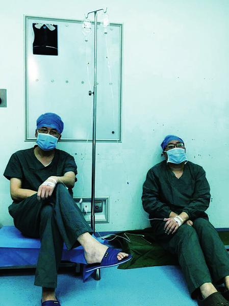 12日下午5時,他做完第三臺手術后,護士正在準備第四臺手術時,他的嗓子像針扎一樣疼,他只好利用兩臺手術的間隔時間,為自己掛了一小瓶抗生素藥液。