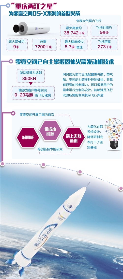 “重慶兩江之星”為零壹空間OS—X系列的首型火箭。該火箭長(zhǎng)約9米,總重7200千克,全程大氣層內(nèi)飛行,最大高度約38.742千米,最大速度超過(guò)5.7倍音速,飛行時(shí)間約5分鐘,飛行距離273千米。目前,零壹空間已自主掌握固體火箭發(fā)動(dòng)機(jī)技術(shù),發(fā)動(dòng)機(jī)推力達(dá)到350kN,能夠?yàn)榭蛻糨d荷實(shí)現(xiàn)0—20馬赫的飛行速度,同時(shí)該火箭可靈活配置燃?xì)舛妗⒖諝舛、姿控?dòng)力等多種控制機(jī)構(gòu),并具有很強(qiáng)的控制能力,可以根據(jù)用戶的需求進(jìn)行定制化設(shè)計(jì),能夠滿足飛行試驗(yàn)所需的各類復(fù)雜飛行彈道。