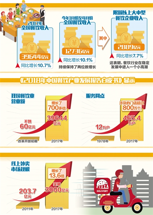 隨著國民經濟運行穩(wěn)中向好,餐飲行業(yè)也由快速回暖步入穩(wěn)定發(fā)展階段。數(shù)據顯示,2017年全國餐飲收入39644億元,同比增長10.7%。今年1月份至4月份,全國餐飲營業(yè)額達12736億元,同比增長10.1%,持續(xù)保持了兩位數(shù)增長。其中,大中型餐飲企業(yè)表現(xiàn)比較突出,限額以上大中型餐飲企業(yè)收入達2889億元,同比增長7.7%。這表明,餐飲行業(yè)在穩(wěn)定發(fā)展中進入了一個小高潮。