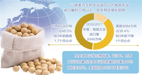 近年來,巴西已經(jīng)取代美國,成為我國大豆最大進口來源地。根據(jù)海關(guān)統(tǒng)計,2016/2017年度,我國大豆進口量9349萬噸,其中,巴西4534萬噸,占48.5%,較3年前提高1.7個百分點;美國3684萬噸,占39.4%,較3年前下降1個百分點。以南美為主的大豆進口已經(jīng)占到我國大豆進口量的六成以上,且呈穩(wěn)定增長趨勢。