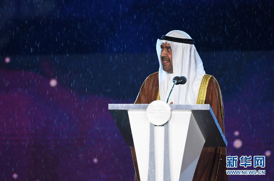 ↑這是亞奧理事會(huì)主席艾哈邁德親王在閉幕式上致辭。 新華社記者杜宇攝