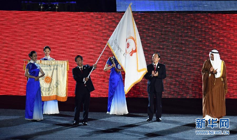 ↑這是亞奧理事會(huì)會(huì)旗在閉幕式上被降下。 新華社記者潘昱龍攝