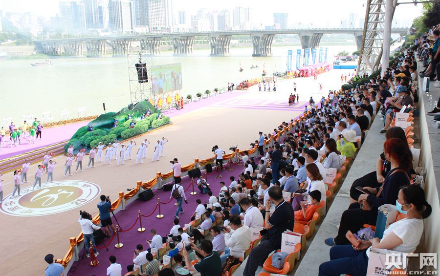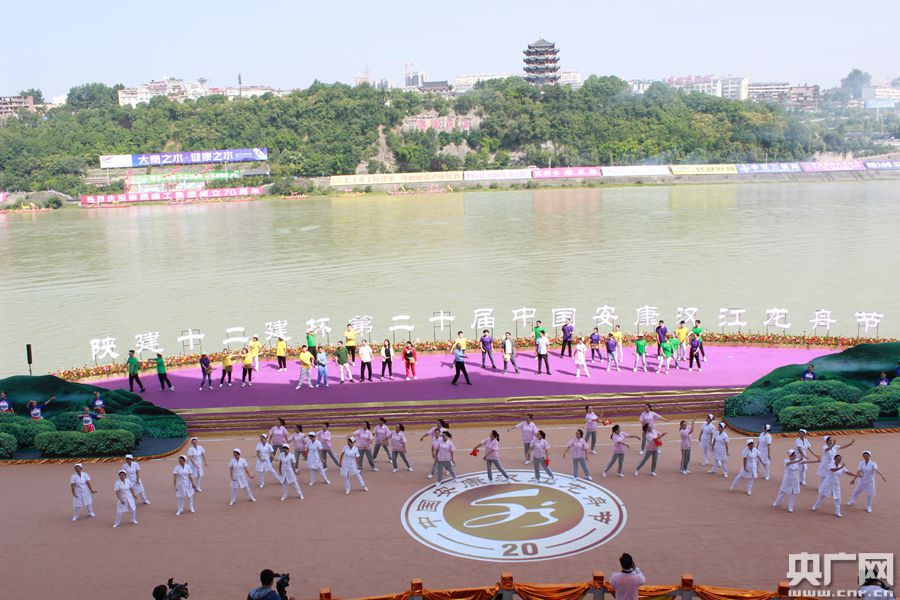 央廣網安康6月25日消息(記者王佳愛 舒隆煥 劉昱)伴隨著渾厚的鐘聲,今天(25日)9:00,第二十屆中國安康漢江龍舟節(jié)主題活動在陜西安康開幕。圖為開幕式(央廣網記者 舒隆煥 攝)