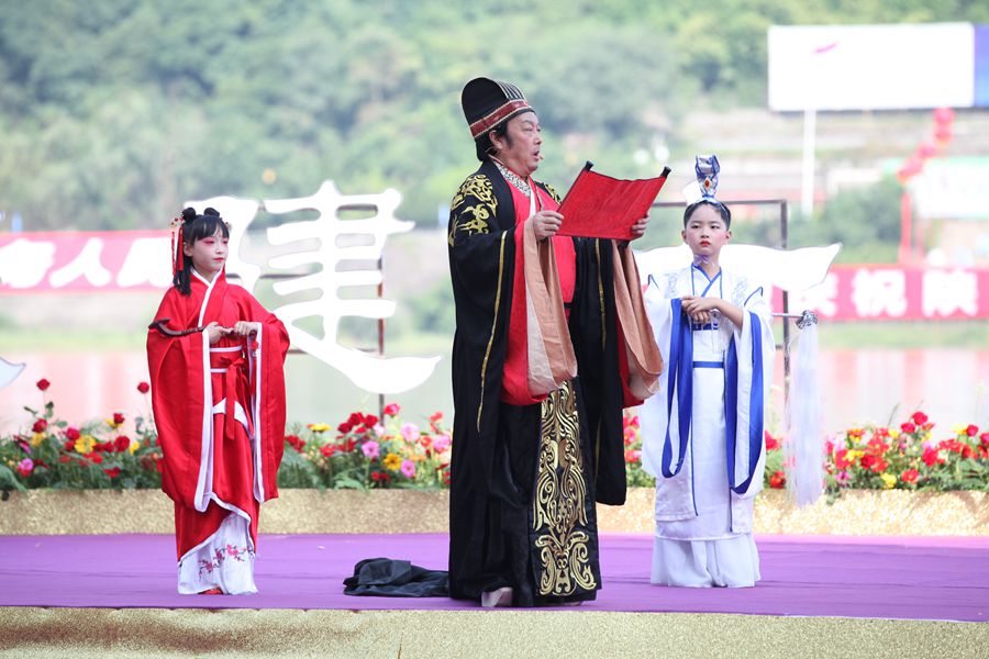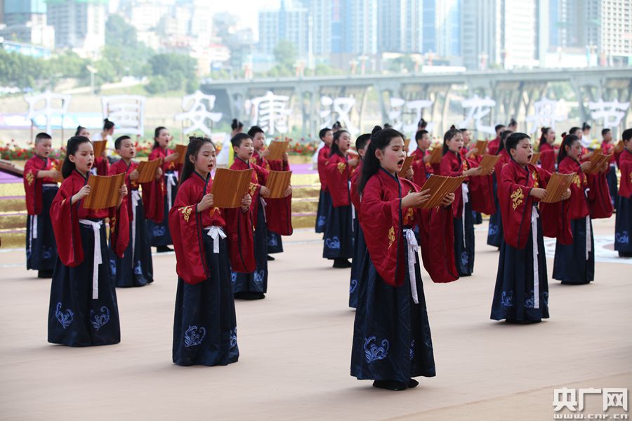 “緬懷先賢”隨著主祭官一聲令下,百名少年兒童方陣,著漢服,持竹簡,緩緩步入舞臺,在悠揚婉轉的古箏聲中,齊聲吟誦祭文。在全場目光的注視下,愛國詩人屈原塑像被9位壯漢護送至舞臺正中。在主祭官的引導下,眾人向屈原塑像鞠躬叩首,并將粽子投入江中,以示對先賢的敬畏與追思。圖為百名少年兒童齊聲吟誦祭文(央廣網記者 舒隆煥 攝)