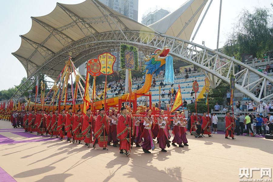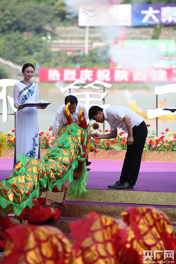 在安康龍舟風俗中的傳統(tǒng)儀式——龍頭祭祀環(huán)節(jié),舞臺上,60面大鼓同時敲響,請龍方陣邁起鏗鏘步伐護送龍頭立于舞臺正中。圖為主祭官指引祭龍、合龍儀式等(央廣網記者 舒隆煥 攝)