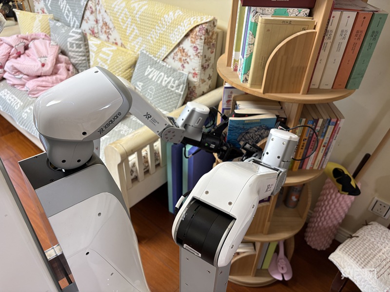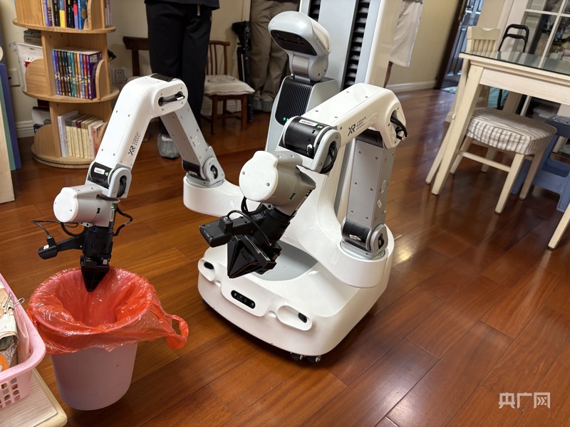 記者在現(xiàn)場(chǎng)看到,機(jī)器人進(jìn)入客廳后,先環(huán)顧四周掃描整體環(huán)境,發(fā)現(xiàn)餐桌上隨意擺放的物品后,便自行到桌前開始整理。幾分鐘后,桌上的物品已按照一條線整齊擺放。隨后它又陸續(xù)對(duì)茶幾雜物、沙發(fā)抱枕、椅子、書籍、鞋子、衣服等進(jìn)行收納,還拿起抹布擦拭桌上的水漬。整理完成后,它提起垃圾桶的塑料袋放置到門外,再給垃圾桶套入新袋子。此外,機(jī)器人還和保潔阿姨合作疊被子,搭檔完成單人操作不便的任務(wù)。