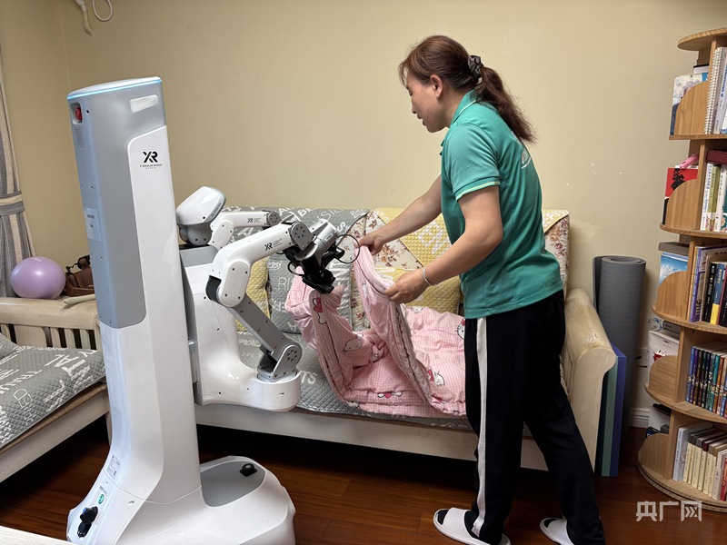 機(jī)器人和保潔阿姨合作疊被子(央廣網(wǎng)見習(xí)記者 鐘金秀 攝)