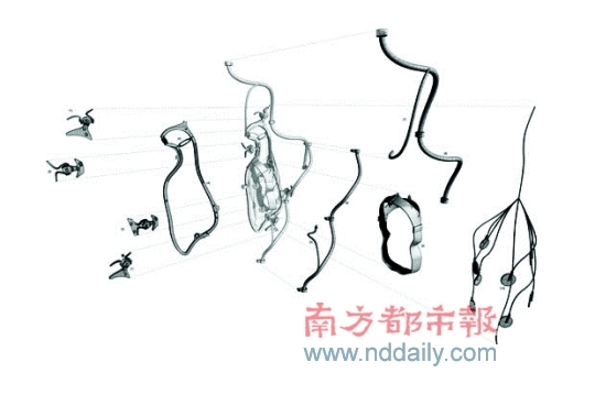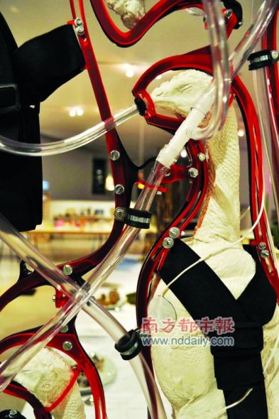 這就是垂直養(yǎng)雞場所需要的裝備:把雞固定起來的架子、為雞傳輸食水和排泄物的管子、負責電流刺激避免肌肉萎縮的電極。