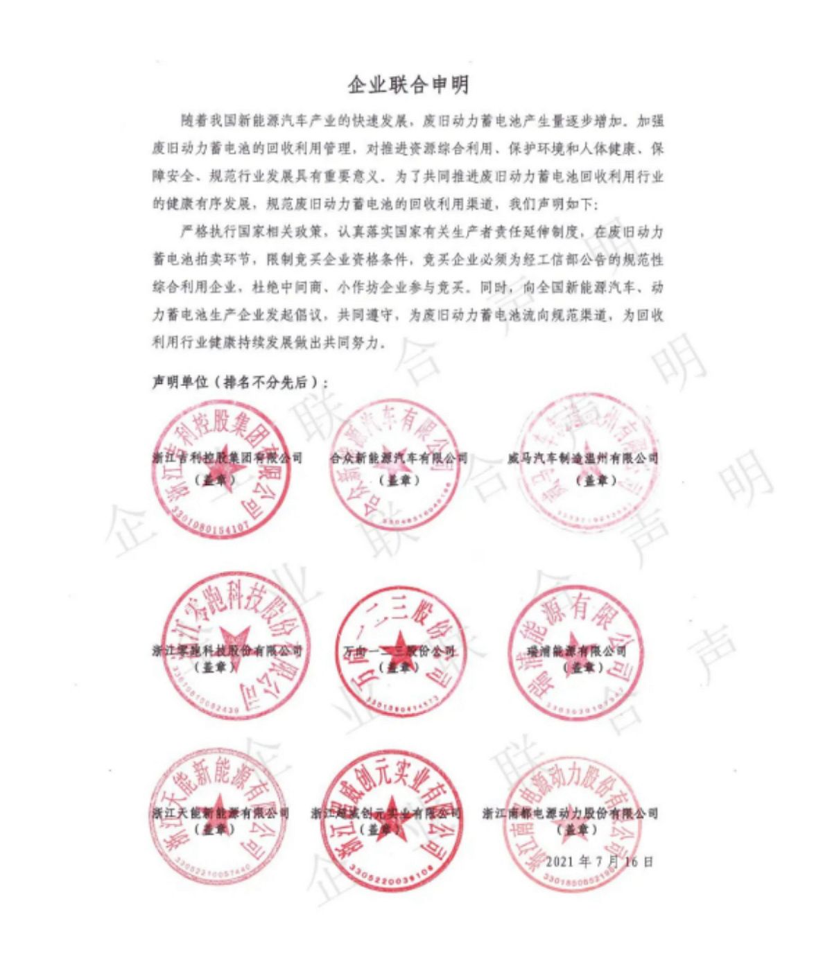 央廣網(wǎng)北京8月12日消息(記者 黃昂瑾)據(jù)杭州儲能行業(yè)協(xié)會微信公眾號消息,浙江省新能源汽車及動力蓄電池生產(chǎn)企業(yè),積極落實(shí)國家有關(guān)生產(chǎn)者責(zé)任延伸制度,規(guī)范廢舊動力蓄電池流向。2021年7月,杭州儲能行業(yè)協(xié)會組織吉利、合眾汽車、威馬汽車、零跑、萬向一二三、瑞浦能源、天能、超威、南都電源等9家新能源汽車及電池生產(chǎn)重點(diǎn)企業(yè)共同發(fā)起聲明,在交易拍賣廢舊動力蓄電池環(huán)節(jié)增加限制性條件,競買企業(yè)須為經(jīng)工信部公告的規(guī)范性廢舊動力電池綜合利用企業(yè),確保電池流向規(guī)范性企業(yè)。