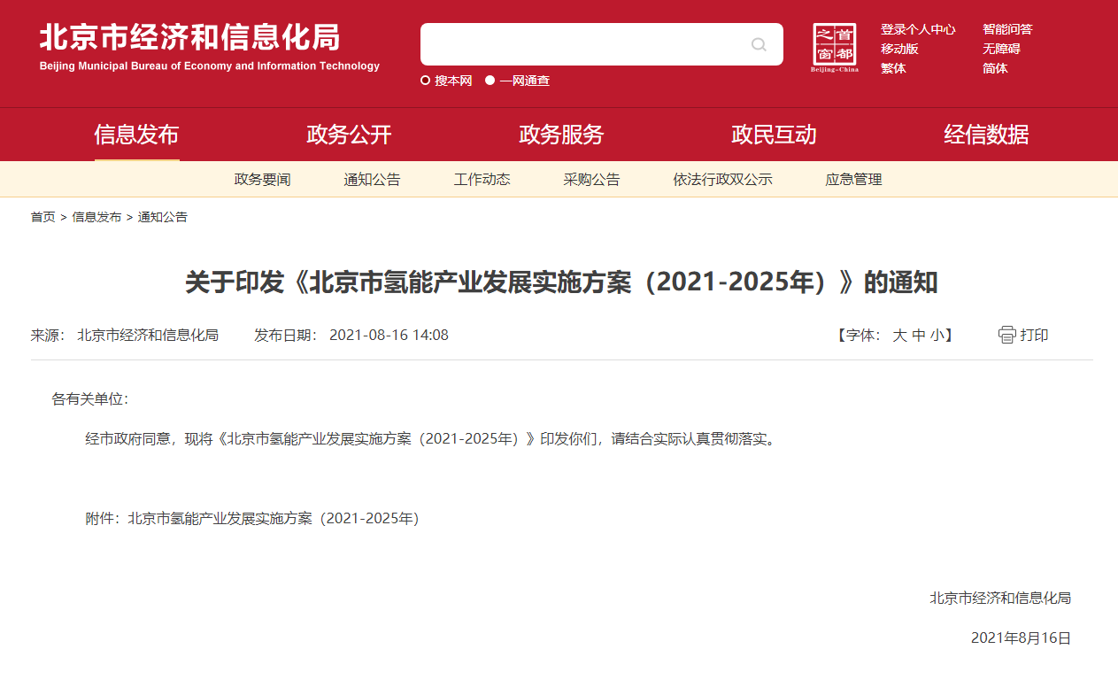 央廣網(wǎng)北京8月17日消息(記者 萬(wàn)玉航)記者從北京市經(jīng)濟(jì)和信息化局了解到,昨日,該局印發(fā)了《北京市氫能產(chǎn)業(yè)發(fā)展實(shí)施方案(2021-2025年)》的通知。