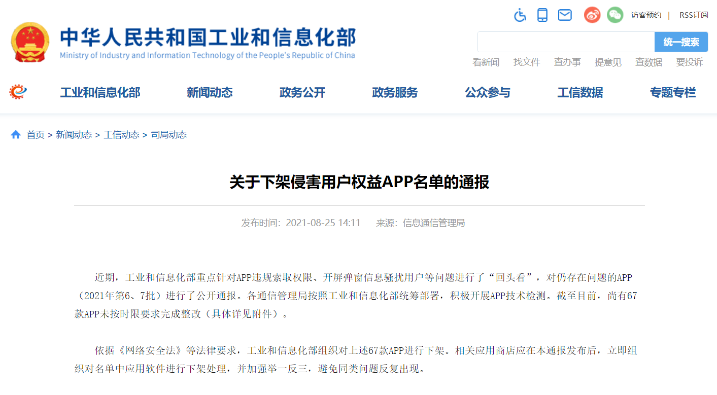 央廣網(wǎng)北京8月25日消息(記者 萬玉航)據(jù)工信部網(wǎng)站披露,近期,工信部重點針對APP違規(guī)索取權限、開屏彈窗信息騷擾用戶等問題進行了“回頭看”,對仍存在問題的APP進行了公開通報。各通信管理局按照工信部統(tǒng)籌部署,積極開展APP技術檢測。截至目前,尚有67款APP未按時限要求完成整改。