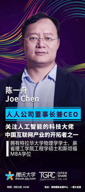 此次公開課除了兩位國外導(dǎo)師,人工智能領(lǐng)域的“中國聲音”也將登臺發(fā)聲。陳一舟,人人公司董事長兼CEO,近年來在創(chuàng)新金融和人工智能方面見解獨(dú)到,曾在多個場合表示“人工智能的時(shí)代即將來臨,這是未來幾十年最大的發(fā)展機(jī)遇”。與其一同發(fā)聲的是騰訊公司副總裁殷宇,作為QQ的掌門人,大量的社交數(shù)據(jù)讓殷宇所在的領(lǐng)域成為AI發(fā)展的一座“金礦”。在公開上,殷宇、陳一舟將與尤瓦爾·赫拉利、Daniela Rus同臺進(jìn)行一場中外AI的巔峰對話,人工智能、機(jī)器人與人類的關(guān)系未來將出現(xiàn)怎樣的變化?我國人工智能的發(fā)展與發(fā)達(dá)國家還有多少差距?哪種人工智能更適合在中國落地生根?我們不妨在課上一聽為快。